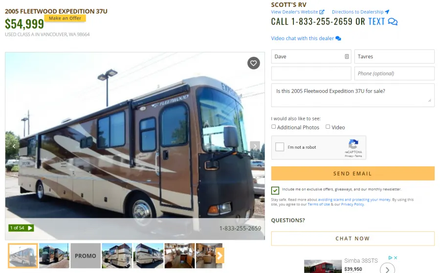 I finally found a 2005 Fleetwood Expedition 37U (VIN: 4UZAAHDCX5CU93093) with 27,000 miles through RVTrader.com. Scott’s RV had it listed for $54,900 (let’s call it $55k) with a fair number of photos, but NO details or other important information about what was included in that coach (all RVs, even the same year, make, and model are not built the same – they are built to order when new.) No details on the listing also meant that there were no information about the age or installation of the tires, the engine, or batteries – just a few of the items that can cost big-bucks as soon as you drive away. So it’s important to know if you’ll need to spend $4,000 on tires ON TOP of the sale price. There was nothing about the size of the A/C units, no maintenance records, and no model details for the 300HP Caterpillar Diesel. The low-resolution photos made it look great. The paint looked good… but without more details, it’s hard to compare against other RVs of the same model, or even against other similar RVs. That said, having few details isn’t the end of the world, but most reputable dealerships will have a build sheet and/or maintenance records available so you know what you’re buying. And so, I called Scott’s RV and was connected with Dan, a friendly guy who sounded in his 60s, who clearly knew RVs.