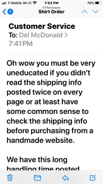 This is a complete fabrication. Actually it had nothing to do with shipping so that must have been another customer that was irate with you. I have screenshots of all emails and None were edited. Actually, anyone can go on "***" or "***" and type in your name and check images and you will see the proof on how you speak to clients. My issue was regarding personalization not shipping.