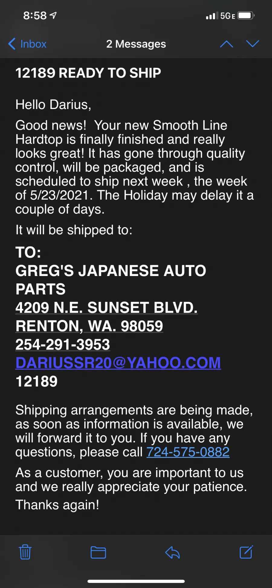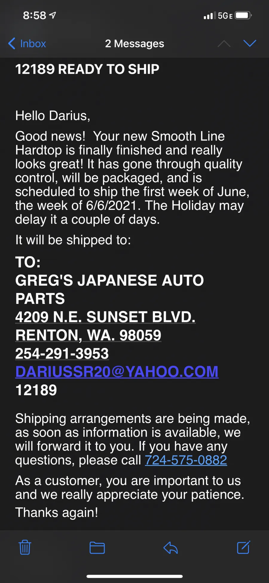 Well I didn’t read the reviews as I should have but I ordered my hardtop Jan 29,2021. Paid in full 3000 bucks. Was told it would take 12 weeks to make. Waited that time and then started calling. The lady who answers the phone who “claimed” her name to be debra knows absolutely nothing. Could never tell me anything. Then I spoke with some one else who was very rude. I asked what was going on and he told me “ I don’t know!” And wouldn’t give me his name. Said I didn’t need that information. I called every week and was told the same thing. It’s been molded. Then after 5 months I finally received an email saying it was complete and was being shipped that week. Never shipped. Got another email saying the same thing it was complete and being shipped the first week of June. Never shipped and that’s where they stopped answering my calls. I’ve left several messages. Contacted the better business bureau and my credit card company in an attempt to either get my part or get my money back. I’ve been working on cars for a long time and this is by far the worse experience I’ve ever had . This is to include several eBay companies from overseas. I don’t know how this company lasts in business so long with complaints like mine and several others I’ve seen. Please buyers beware! Find another source. They will take ur money and at best get u a part when they feel like it or at worse take ur money and you get nothing. It’s been 6months now and I’m still waiting and they won’t answer my calls since my number comes up on caller id. And I’ve called so much. Attached are the emails they sent. As stated it’s “supposedly “ been complete but won’t ship it. June 15,2021