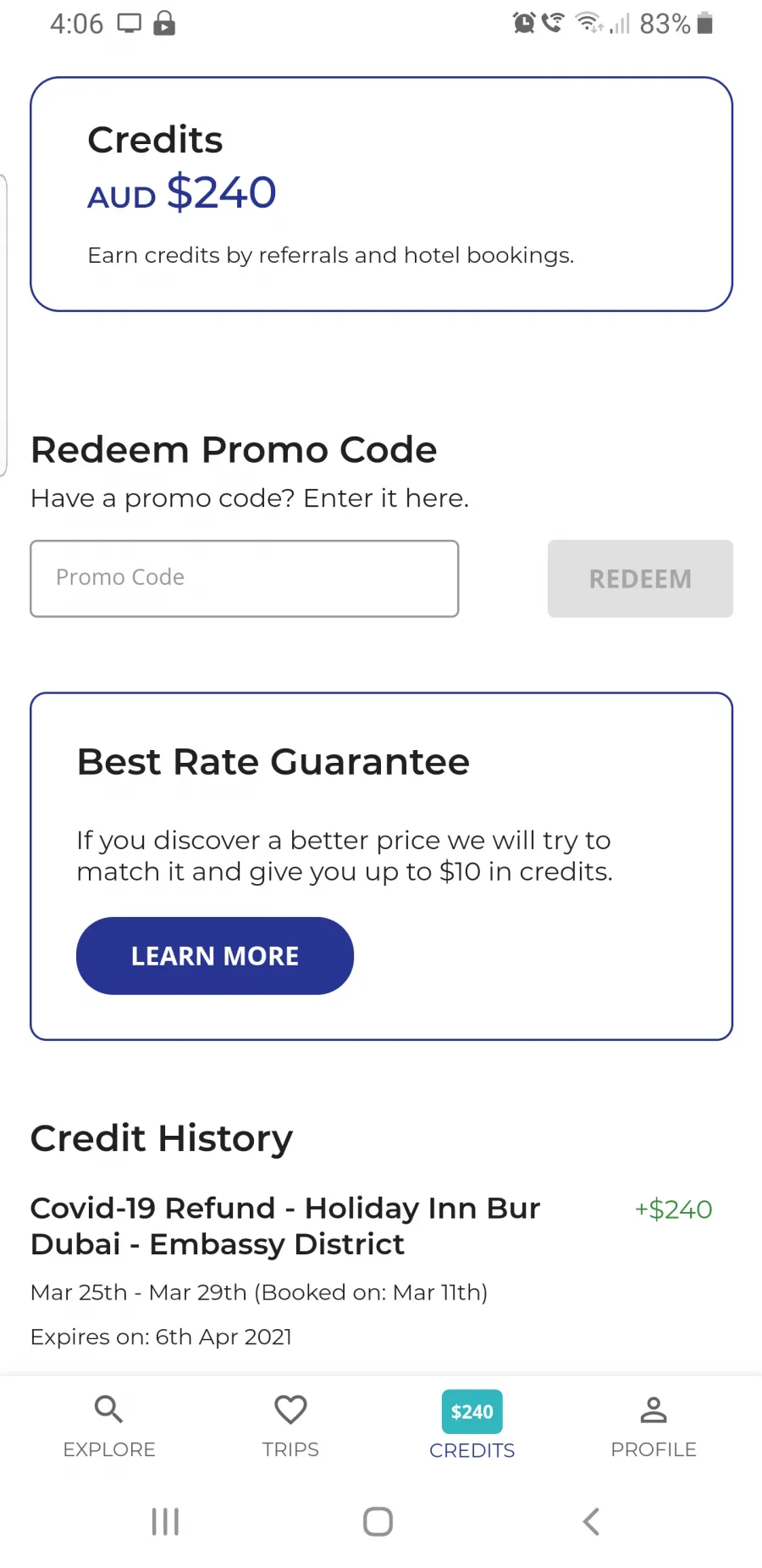 Now I tried several times to book some hotel in the past few months at different locations, each time I am getting the below message which mean I cant use this credit at all. SnapTravel is not helpful, they only text me to try find another hotel. I spent several weekends to find any sigle hotel which will accept this credit on their app but no luck at all.