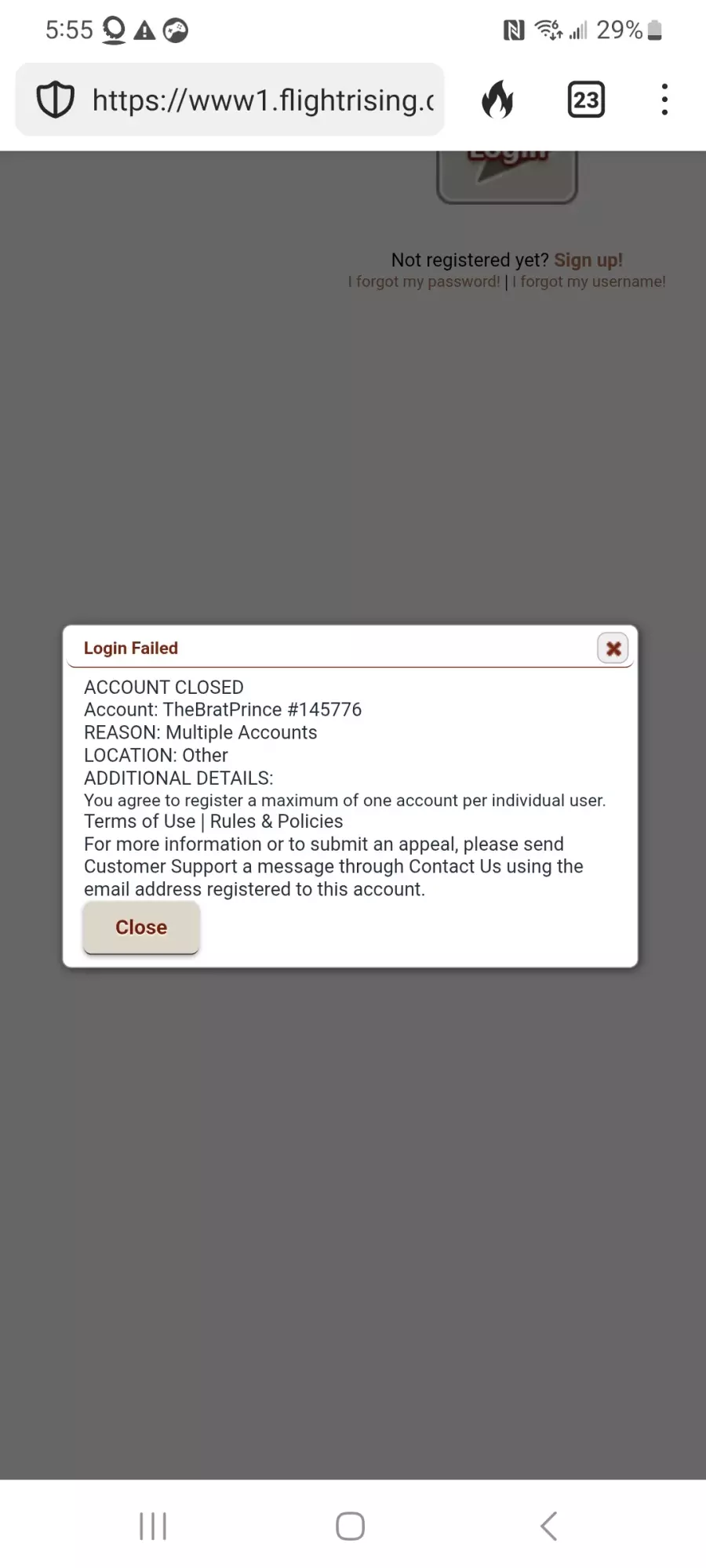 I had posted a fair and respectful opinion on the cirrus dragons, and when I went to do games I noticed I was logged and thought my browser was being dumb, I was forced logged out and got the error of account closed due to having multiple accounts when I tried to log back in. This site needs to close