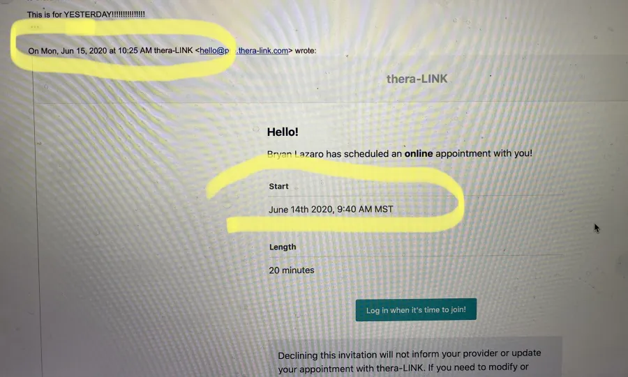 After calling the office to tall them once again the meeting did not take place, them saying well they are showing the meeting, I get a message from Theralink about my appointment scheduled for the DAY BEFORE! See the picture, this is insane!