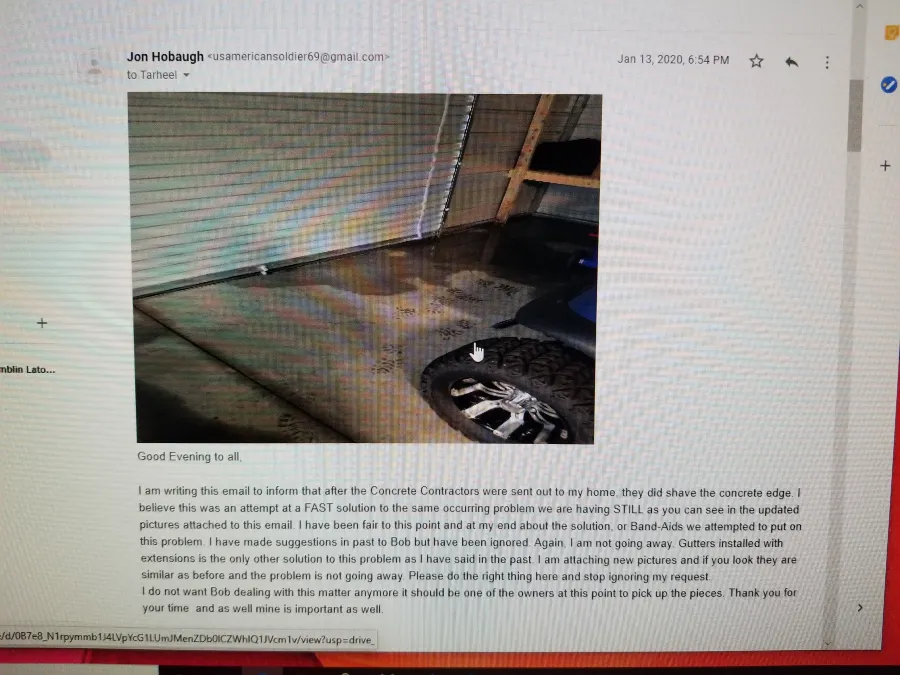 We will have someone up to the customers home within the next two weeks weather permitting to have a drain with grate installed in the concrete between the extra pad and the buildingThis should take care of any water trying to come into the building