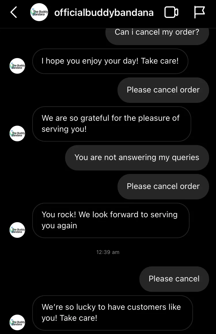 The thing that angers me the most is that they changed it up and started blaming me. Like I am very sorry I put the wrong address (eventually I was okay with that address) but that's literally the only wrong thing I did. They made me feel stupid and were very rude. I could not believe my eyes when I saw their replies. Like what the heck dude just give me my full refund. THIS IS A SCAM BUSINESS. NEVER BUY FROM BUDDY BANDANA. I