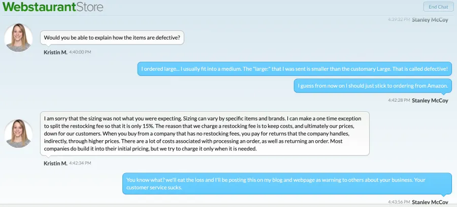 I have ordered from Webstaurant before with great results. So when I saw some lab coats that I was searching for on their site, I didn't hesitate to place my order. My staff usually takes a medium size, but because we are aware of size fluctuations, I ordered Large. When we received them, I had someone try them on. They were marked "Large", and which would have been accurate if the person was a child. None of us could get the coats on. So I went back online and initiated a return. The system rejected my return and indicated that I would need to speak with customer service. I entered into a live online chat. After explaining my problem, I was told that I could return the coats with a 30% restocking fee plus shipping. In other words, it would cost me more to ship them back than what I paid for them. When I objected to this, because their defective sizing was not my fault, she then offered to "split the restocking charge". See pic. I ended the chat. Soon afterwards I received a marketing email from Webstaurant. I went back into the chat and asked to be removed from any future contacts. The same rep then said she "would waive the restocking fee this one time" but I would still have to pay shipping. I basically told her to pound salt, and we would eat the loss and not do business with them again. I am posting this review everywhere possible.