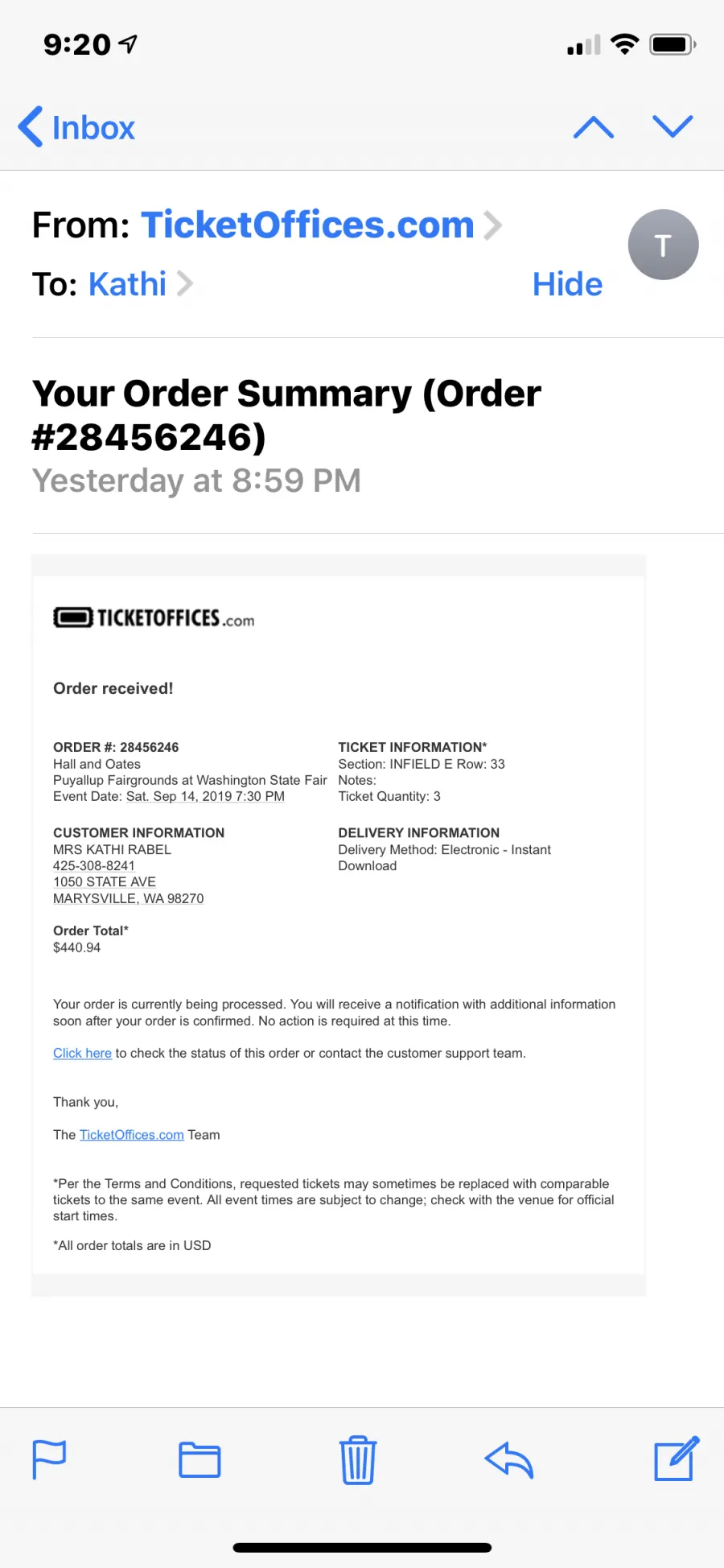 I purchased 3 tickets last night for a Hall and Oates concert at the Washington State Fair on Saturday September 14, 2019 for $440.94 total (way more than face value + fee which I was willing to pay). When I went to print out my downloaded tickets they were for Jeff Dunham on Friday, September 20, 2019? I bought these from Ticket Fulfillment Services LP which had a totally legit looking online website called ticketoffices.com and used my PayPal account. I tried calling the customer support line which was no help at all and also emailed them but all I received back was a customer survey wanting to know if I would recommend them?!?!? Are you serious? I opened a claim through PayPal but now see they won’t help me wish I would’ve used my cc so I could’ve gotten my money back! So mad right now! This is such a scam! I am going to post all over social media and tell everyone I know what a scam this company is! Terrible!