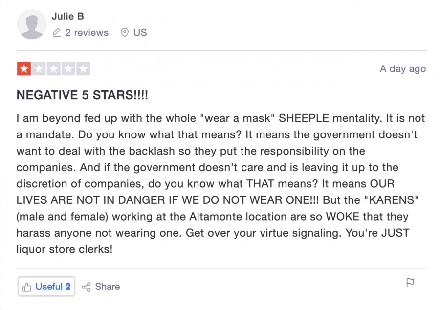 Their dumb suppression muzzle policy as a "private company" is based on absolute nonsense as they aid in the perpetuation of the enslavement of all of us. I recommend never stepping foot into this company as long as they side with the extreme nefarious agenda at play.