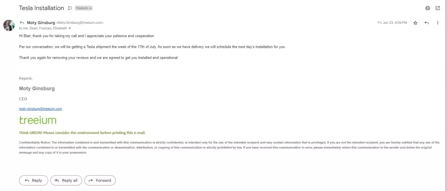 Moty Ginsburg (the owner of Treeium) sent me the following email: “Per our conversation, we will be getting a Tesla shipment the week of the 17th of July. As soon as we have delivery, we will schedule the next day's installation for you.” This did not happen, nor did he contact me at ANY point after the missed date.