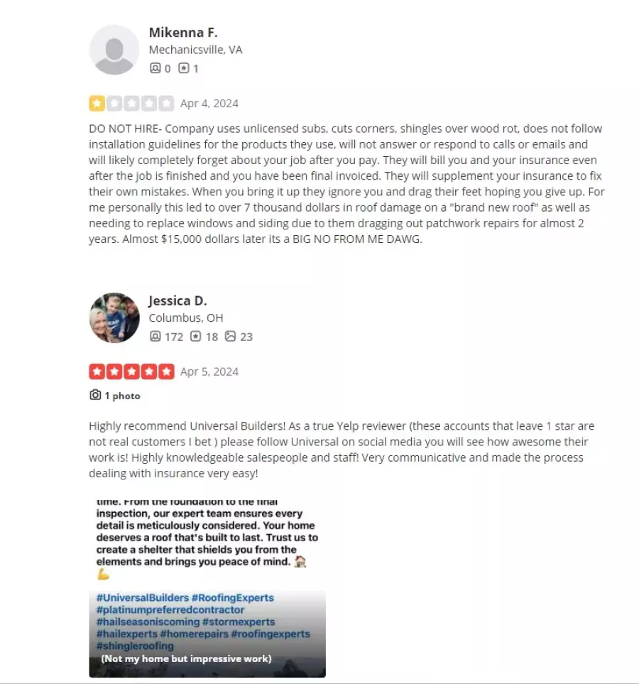 They do good work when the decide to do it (except their cleanup after the roof work was not complete). Getting them to do it and keeping the customer informed is a different story. Will not go into the entire ordeal (unless requested). It took them over 6 months to do a roof, repair some siding, and paint 2 interior rooms. Taking out issues on our side, it was still 5 months. During that time the only contact we had, initiated by them, was to sign contracts and contract changes and to get paid. We fired them once due to lack of communication but gave them a second chance on their word they would improve. They did not. There were things on the invoice that were not performed (this happened twice). They gladly removed the items, but the question is, were they trying to get more money or were not aware of the work they had completed. After the 6 months, when the work was finally done, they expected final payment in 4 days (actually they wanted it sooner but we were out of town). Bottom line, if you are looking for a contractor who focuses on your satisfaction and works with you every step of the way, Universal is not for you. They came highly recommended but came nowhere close to the hype.