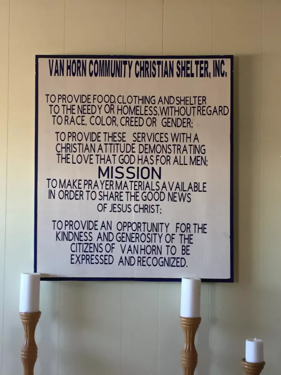 I've worked for VAN HORN COMMUNITY CHRISTIAN SHELTER going on for 5 years. Not only do I work work for the VHCCS I also work with the Salvation Army ringing of the BEll and help with the Domestic Violence. I am here to help those whom no other wants to help. The homeless and transients are people too which they need our help. We are the only shelter 120 miles from either side of highway.