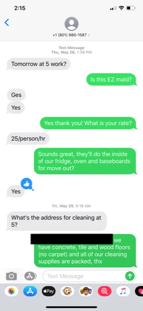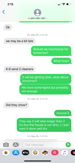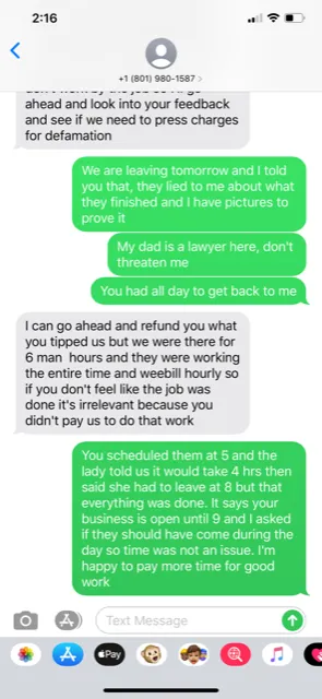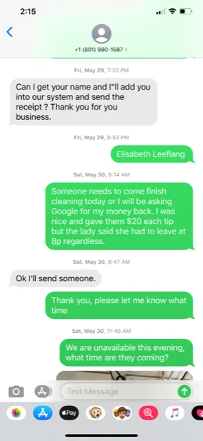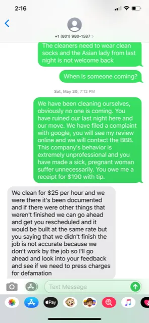 He said he would send out a cleaner to finish and never did, then sent belligerent texts when I told him I would file a google claim, contact the BBB and leave him a review on google - for which he threatened pressing charges for defamation. He offered to refund the $20 tip I gave each cleaning girl ($40 total). I tipped just to be nice even though I knew the job was unacceptable for a move-out clean, which is what I booked. He still has not provided a receipt, which I requested several times. The screenshots below tell the story. I wish we would have taken more pictures before we undertook finishing cleaning ourselves; I was nearly 5 months pregnant with twins and this was terrible for me. We had to clean up the tile, all the bathroom drawers and shelves, actually mop the floors, finish the kitchen, etc. all of which took an additional 3 hours. We should be able to trust Google-backed services; Google refunded us everything but the tip even without a receipt.
