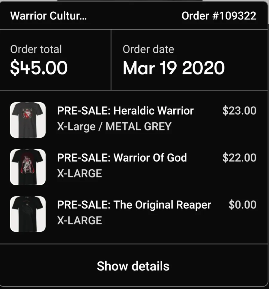 I ordered $60 dollars in products at the end of December. After more than a month with no word I emailed to check on my order. All I got back was a snide automated response that basically said they are busy and will get to my order when they get to it. Weeks later my order shipped. I received 1 of the 4 items I paid for. Everyone makes mistakes so I emailed customer service 3 times with NO response. I finally left a bad review and had to post on their Facebook page to get a response. The guys at Warrior Culture “never received my emails” despite the fact that I used the link they provided. I definitely got. response after the Facebook post. I was “petty” for expecting them to actually provide what I paid for. I told the guys I would give them til Friday (4 days) to just ship my order and we could all move on. I was told they were “done here” but that I would get my tracking number. That never happened. Thankfully PayPal protects users against scam artists and horrible businesses. I filed a complaint and 10 days later I just got an email that said my money would be returned. Those guys never even responded to PayPal’s attempts to resolve the issue. There are too many other businesses on the internet that sell cool T-shirt’s to give this fraud a dime.