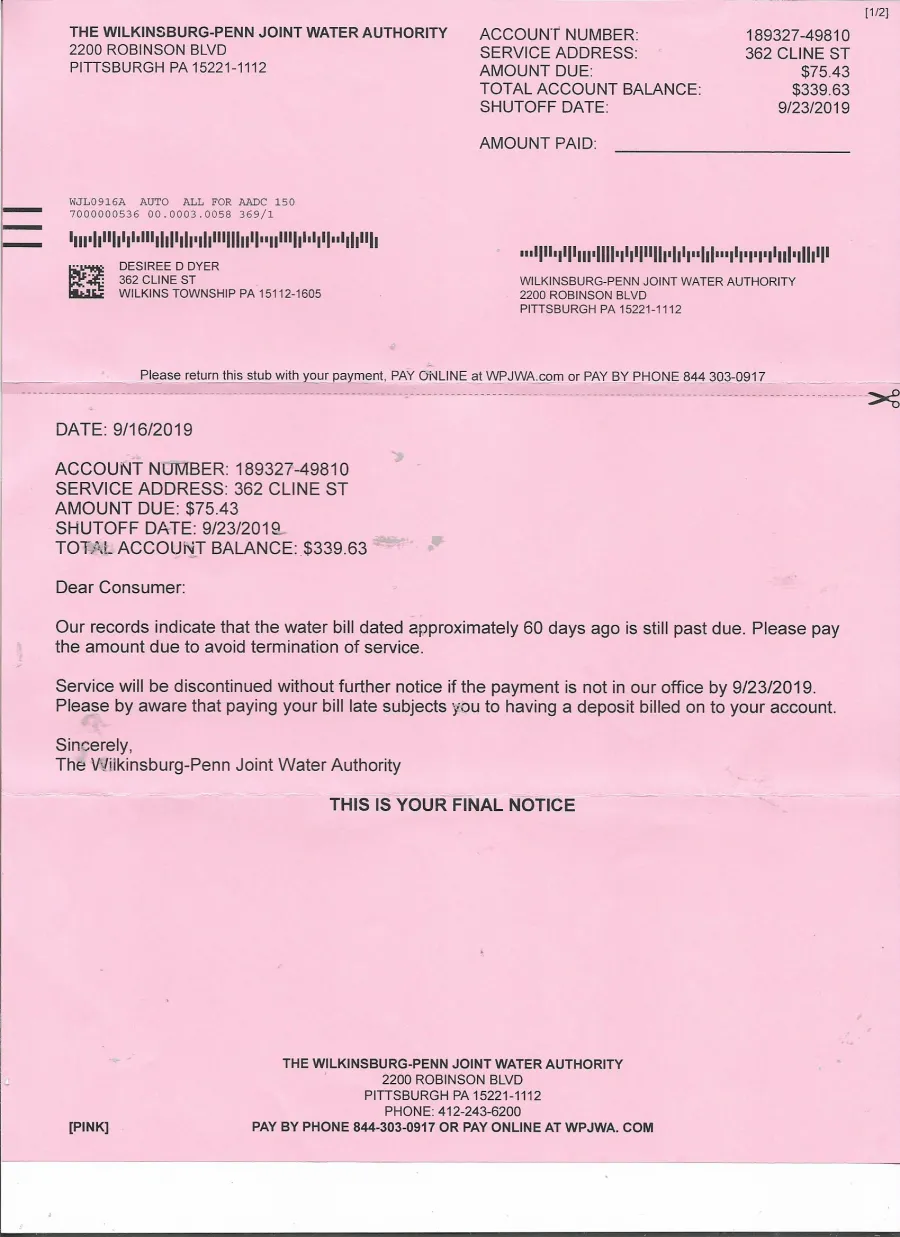 Review: I have had continual problems with Wilkinsburg Penn Joint Water Authority with termination of mywater service. I live at [redacted] in Penn Hills Pa 15235 and WPJWA water authority as terminated water service on 09/23/2015 for non payment. I paid my monthly water bill on 09/03/2015 in the amount of $82.00. I am never behind in my payments and I am never late with monthly payments; however, Wilkinsburg Penn Joint Water Authority representative and credit manager Ms Juanita R[redacted] states that I am always late and I am now paying June monthly waterbill. Again, I state that I am never late and my payments or made on a monthly bases on time. I collect Social Security Disability Workers every month, so there would be no reason for late payments, my service is in the name of [redacted] which is my mother, reason is we have not had time to change service names. I would like to have an order for immediate restoration of my water services which is against the law to terminate in case of fire and hazardous situations.Desired Settlement: The immediate restoration of my water service to [redacted] or [redacted] Penn Hills Pa 15235, and the adjustment of my bill.