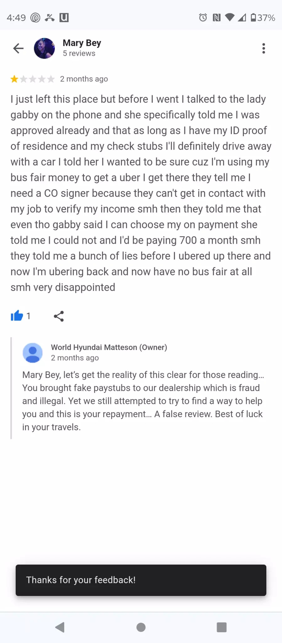 Initial Business Response / [redacted] (1000, 6, 2014/03/27) */ We have reached out to [redacted] and asked that they be removedWe will report to Ms [redacted] if we have any updates Initial Consumer Rebuttal / [redacted] (3000, 8, 2014/03/27) */ (The consumer indicated he/she DID NOT accept the response from the business.) This letter is missing so much pertinent information a blind man can see it is falseWhere is SS Number, [redacted] address, and all other Credit Bureaus addresses? Plus this was sent to an outside parties e-mail address from a non business e-mail from [redacted] and then sent to me Final Business Response / [redacted] (4000, 10, 2014/03/31) */ In an effort to keep the clients information out of the public eye, as the Revdex.com maintains such info publically, we did not include specific personal information in this transmittalWe do have a separate letter with her information so that the credit reporting agency can identify her accordinglyThis already been sent to the agency Final Consumer Response / [redacted] (4200, 12, 2014/04/03) */ (The consumer indicated he/she DID NOT accept the response from the business.) I asked for a copy to be sent to me of what they sent to Credit BureauThey can say anything as is there practice of doingThe only reason they said they left out information that was sent to because you sent them my reply of what was was missingWhen I informed them that pertinent information was missing they resent same letter with it being Notarized at bottom through someone elses e-mail againThe Notarization doesn't mean a thing because they have a Notary at businessNotarization is for signature purposes only not contentWhen Mr [redacted] sent me this e-mail he claimed this was letter he sentI have contacted Credit Bureau and they have received no information from World Hyundai with any of my information or requesting removal so they are still lying!! How is leaving off Credit Bureaus address and phone number and point of contact protecting me