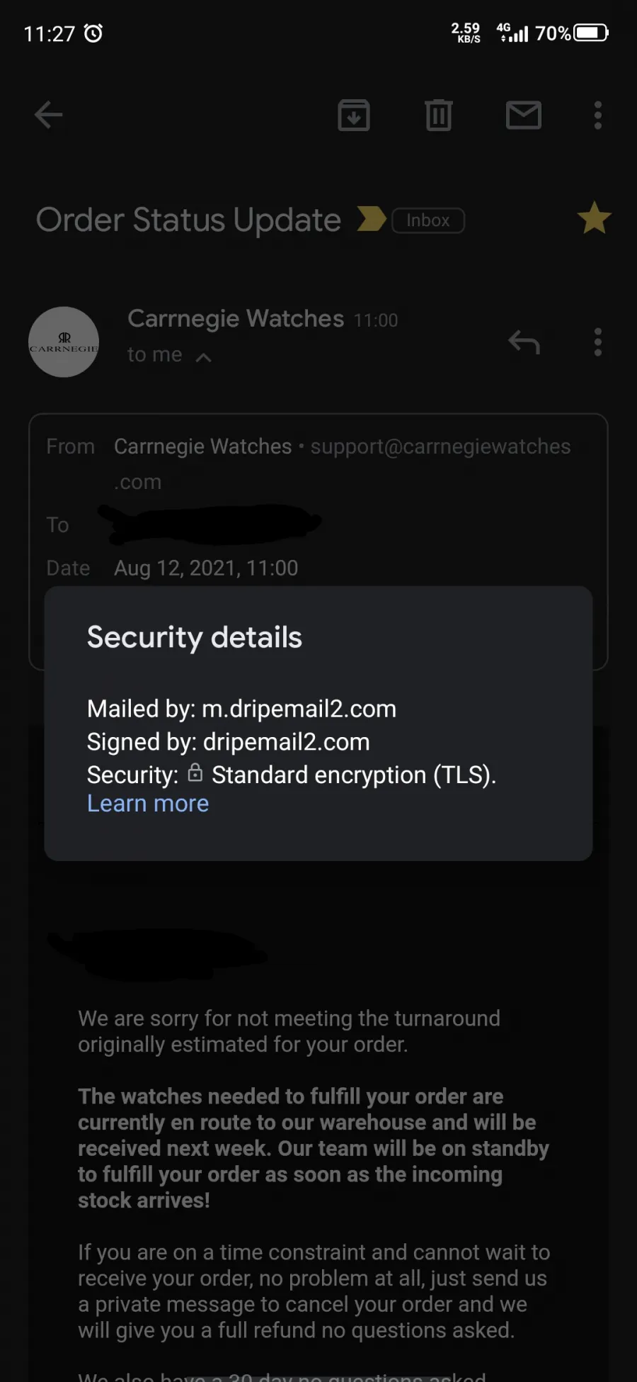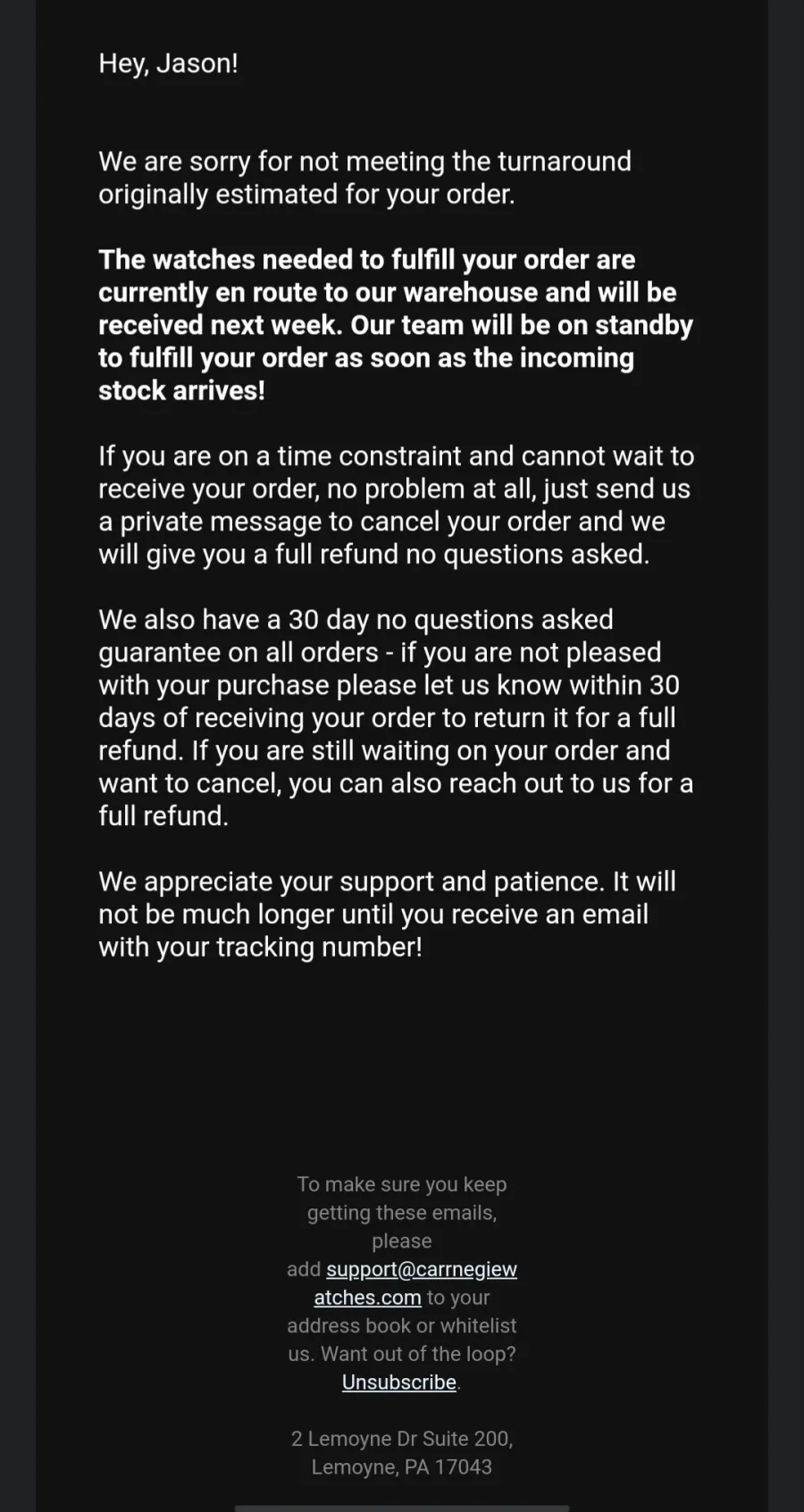 Oh look. I got an email today. Assuring my order would be delivered. From Carrnegie support email but email came through dripemail2 server. Looking more and more like a scam. I'll retract if I ever get the product.