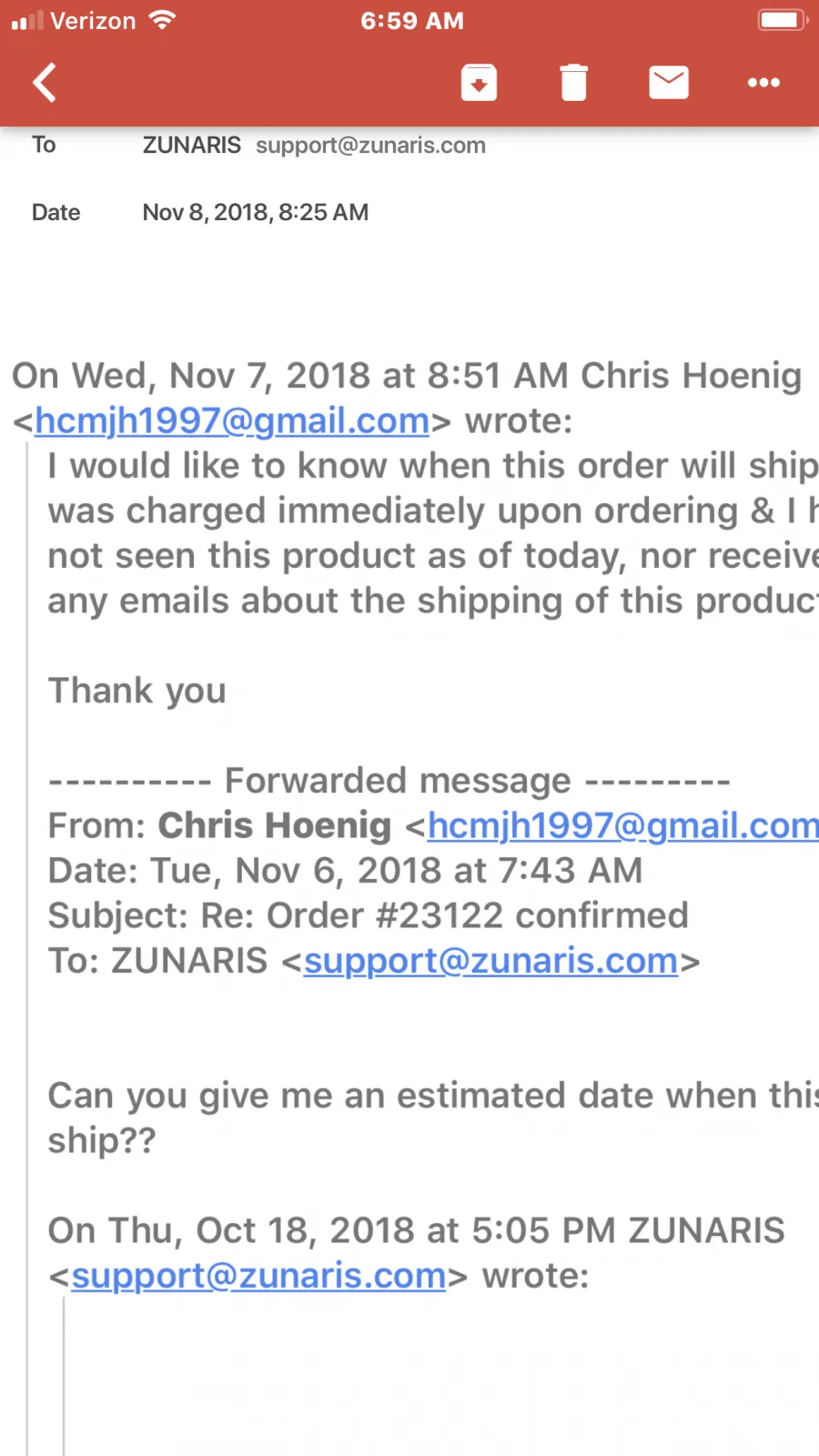 I made an order on 18 Oct and of course billed immediately. I received an email the same day stating the order had been received and that I would receive an email when the order shipped. I have not received this email, I have sent emails requesting the status of this order and have not received any response.